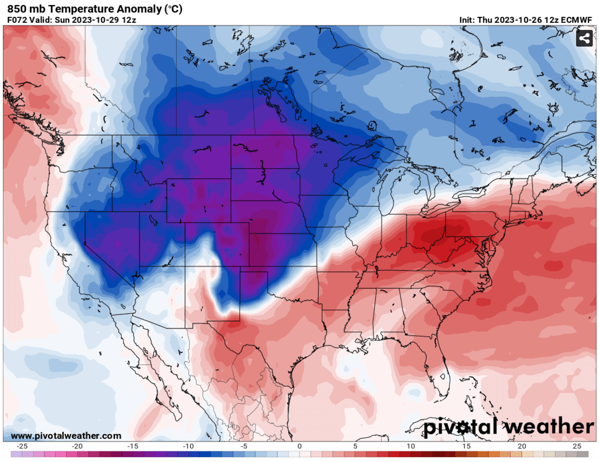 Polar Vortex is affected by October Snow extent in an unexpected way , In the latest european operational forecast of the polar vortex, the stretched pv is directed at the eastern us and not the western us in contrast to the gfs.